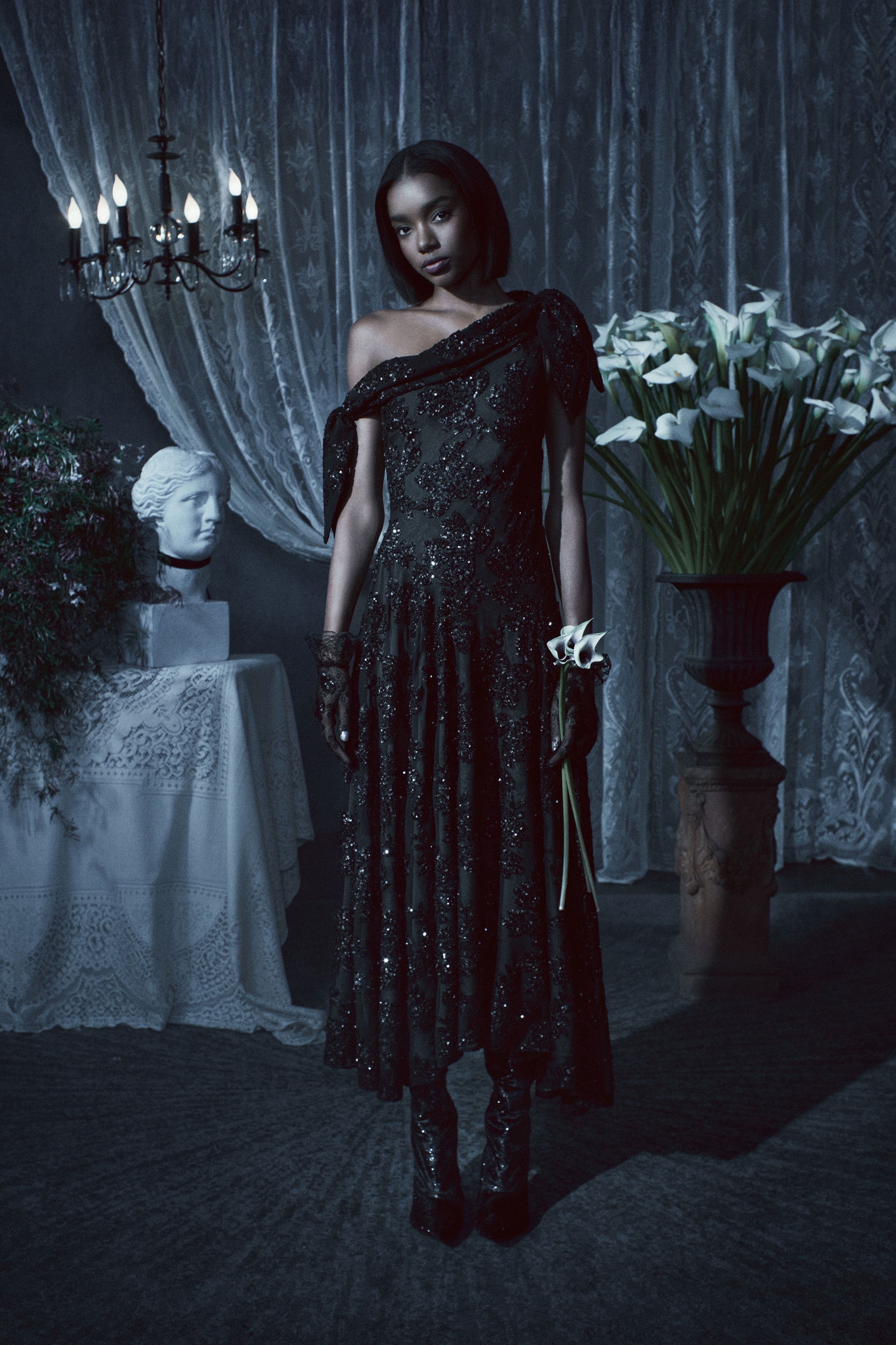 White Silk Crepe Bias Dress With Black Velvet Ribbon Bow Detail