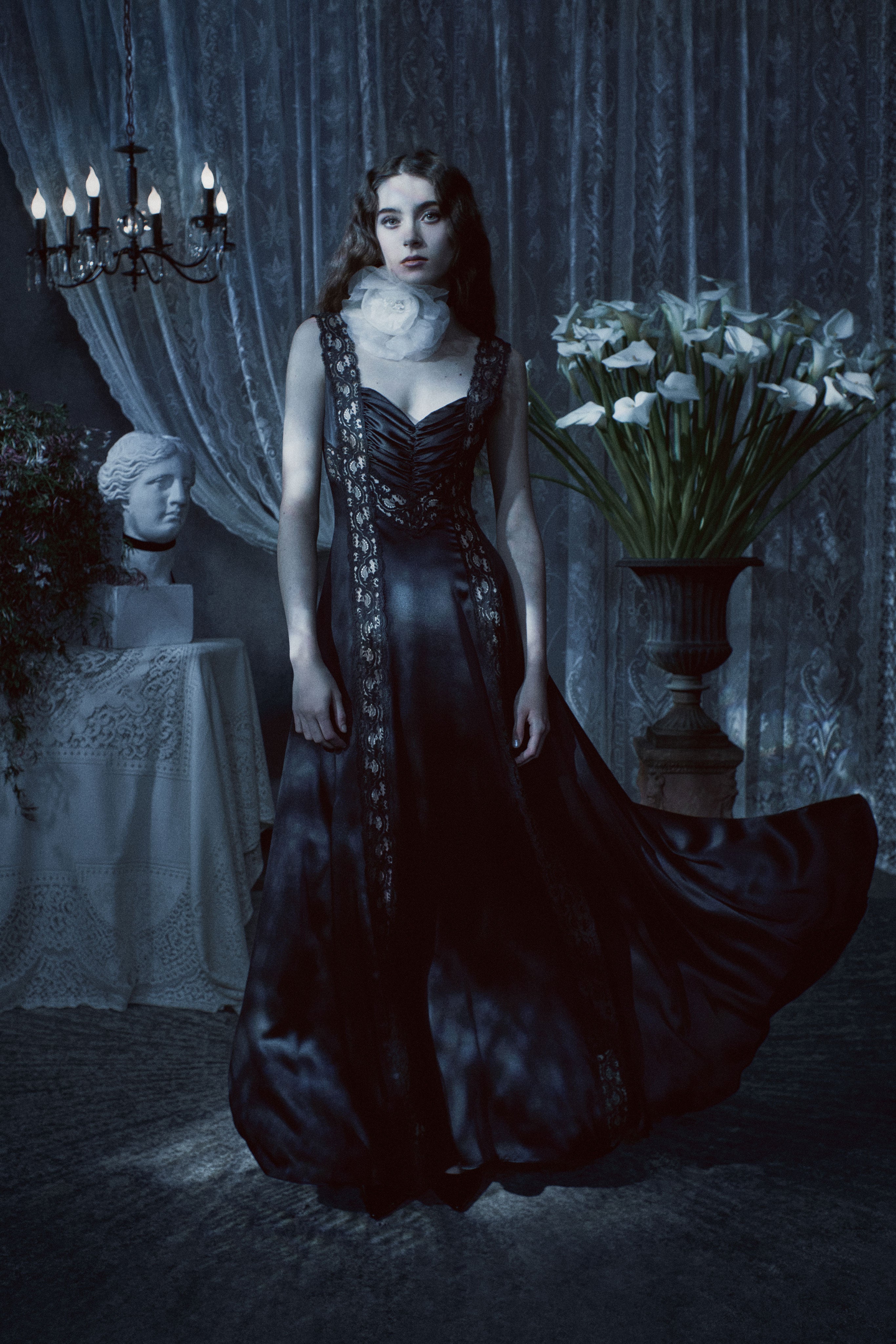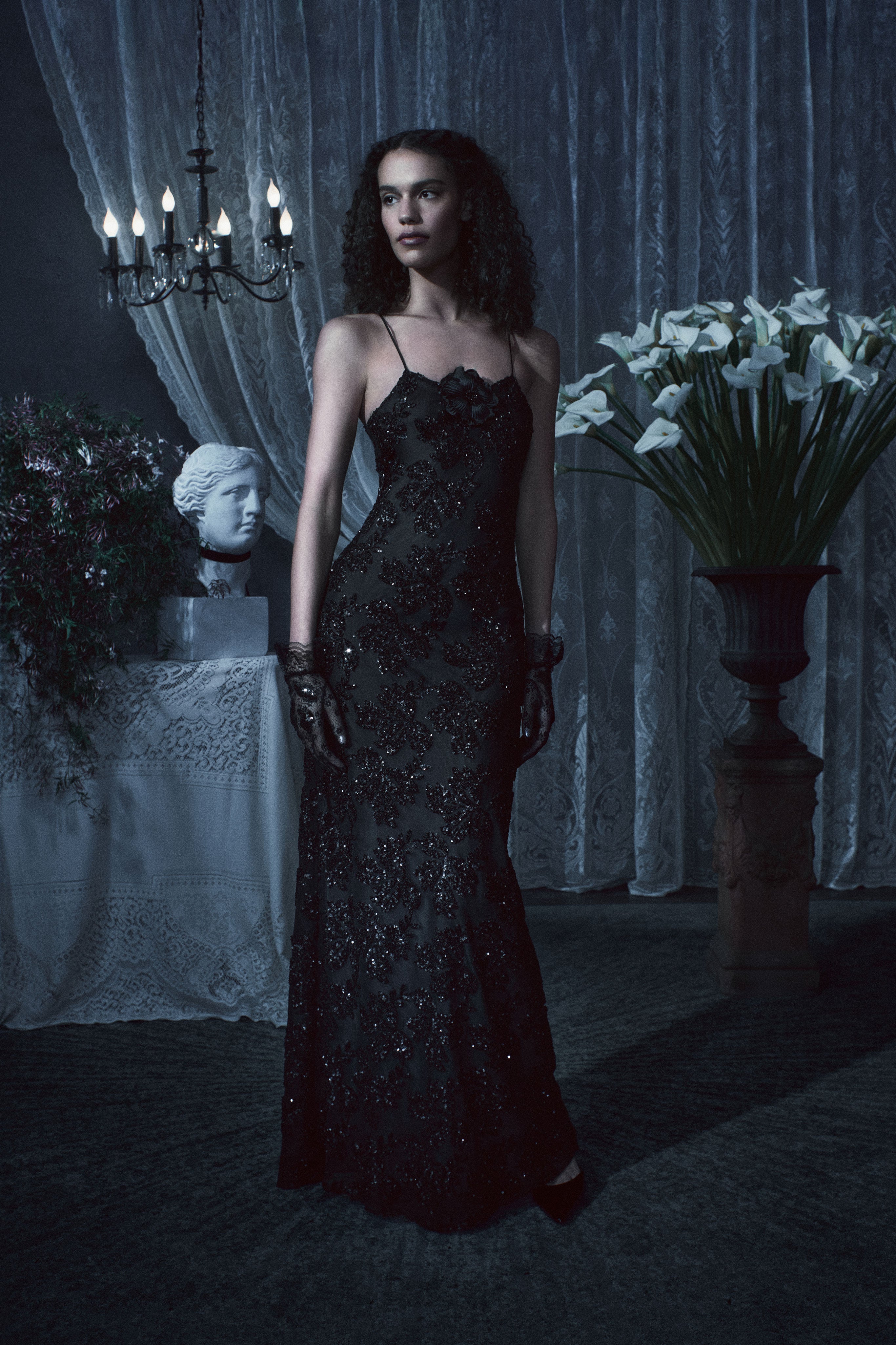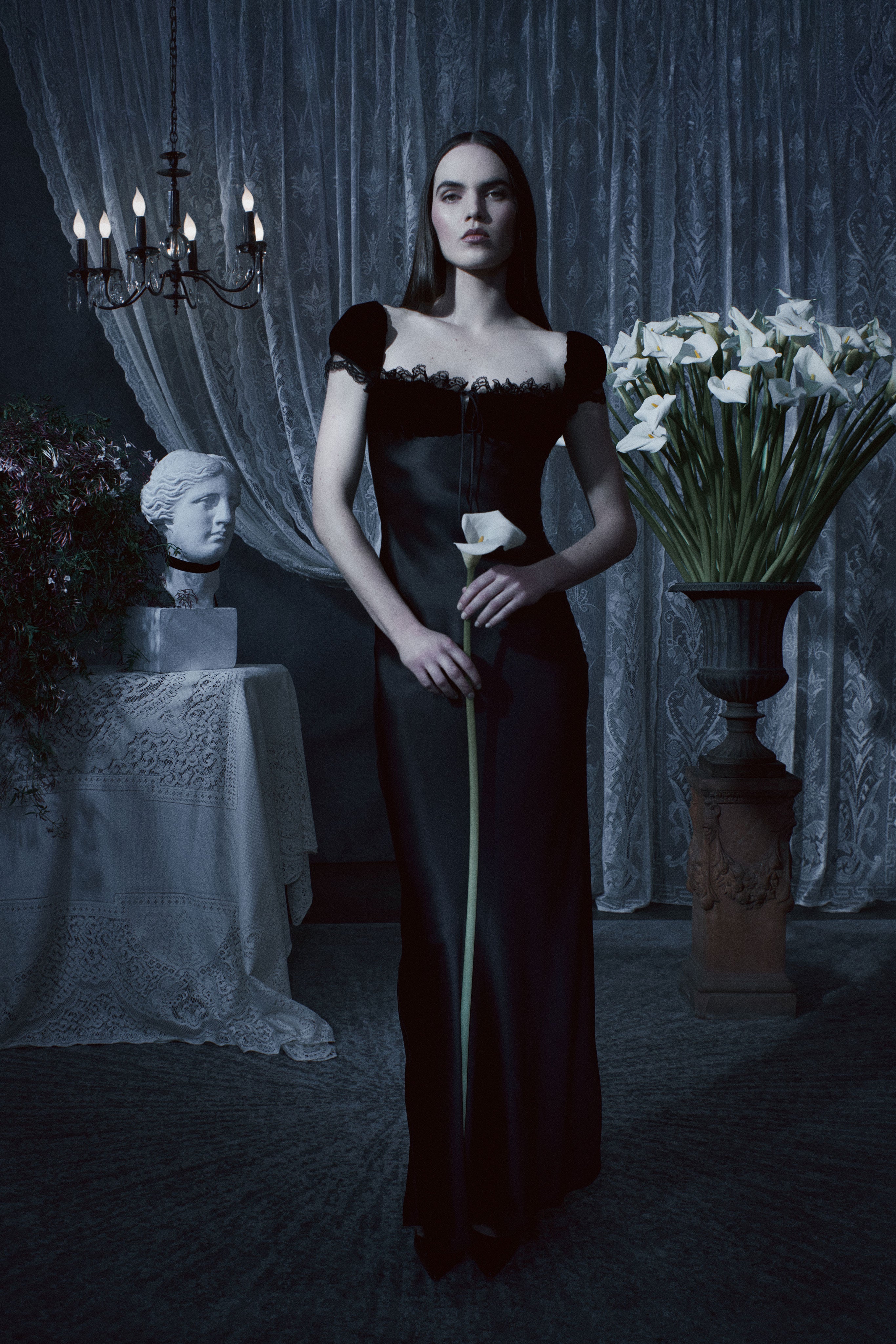 Black Silk Charmeuse Bias Gown With Lace Inlays